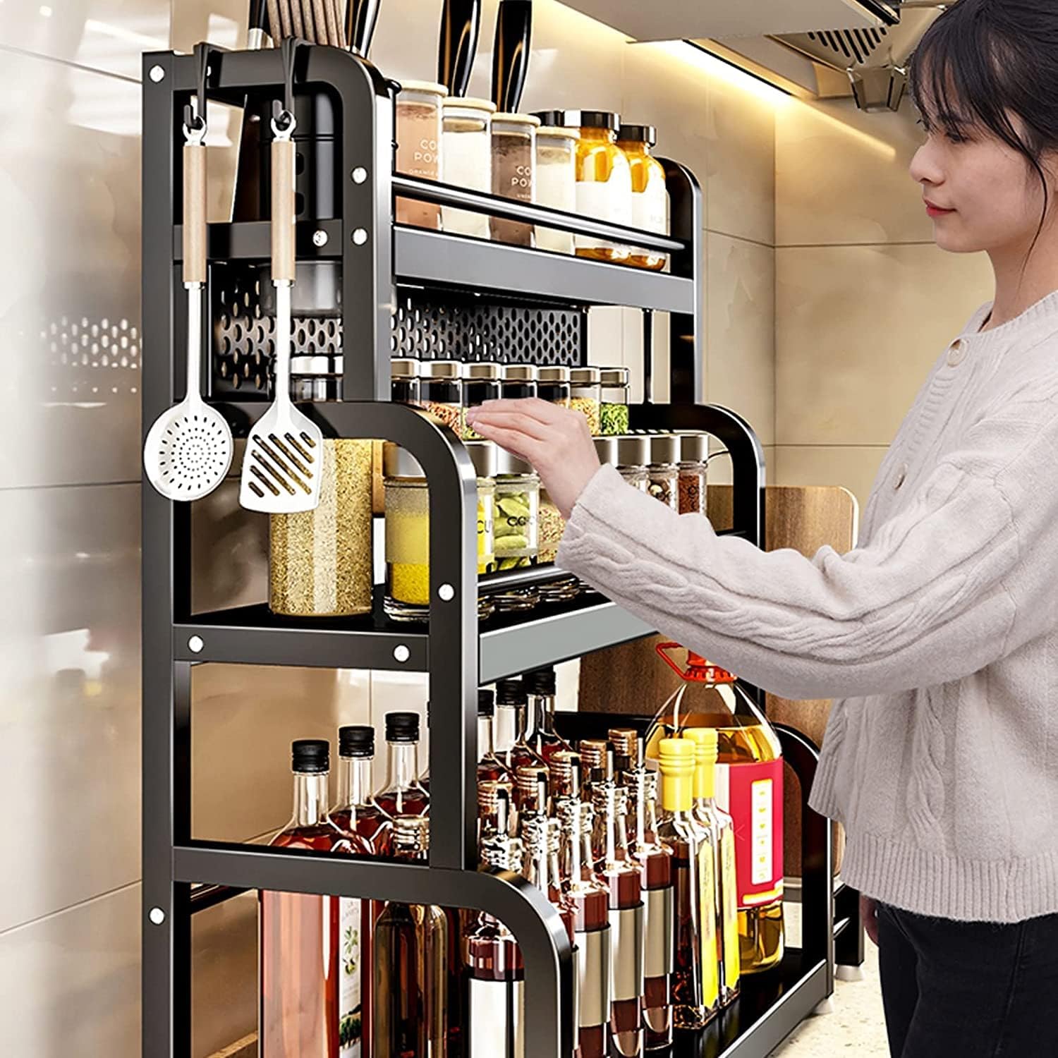 Su diseño vertical y de varias capas aprovecha al máximo la encimera de tu cocina, manteniendo todo al alcance de la mano y perfectamente organizado.