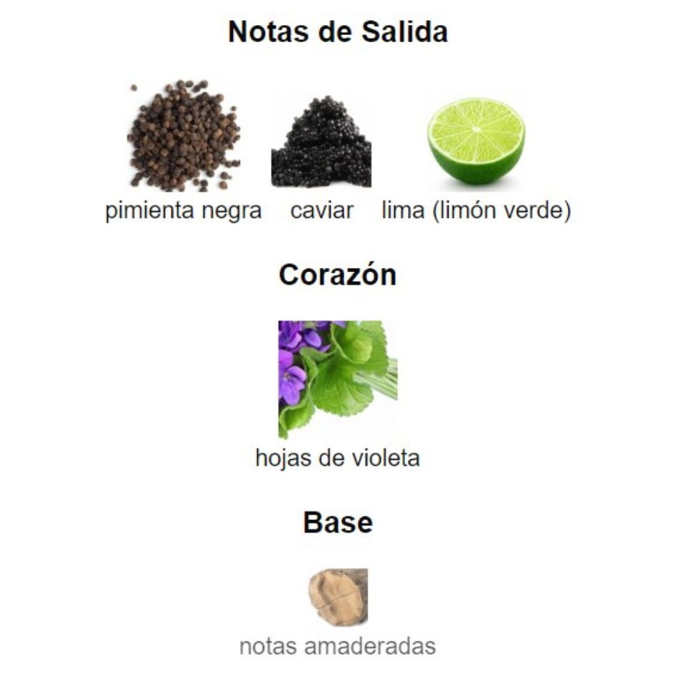 - Notas de Salida: Pimienta negra, caviar y lima (limón verde).