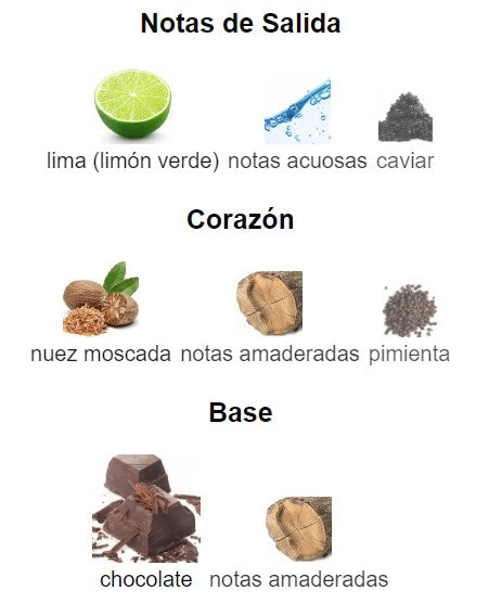 Las Notas de Salida incluyen una refrescante combinación de lima (limón verde), notas acuosas y caviar, que aportan frescura y vitalidad. En el Corazón, las notas de nuez moscada, pimienta y madera crean una mezcla cálida y especiada. Finalmente, las Notas de Fondo, con chocolate y un toque de madera, añaden un final dulce y seductor.