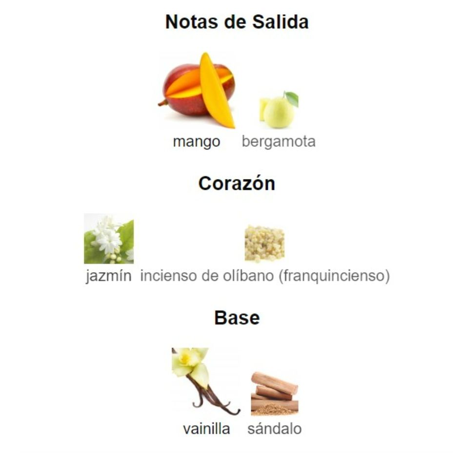 - Notas de Salida: Bergamota y mango, un inicio fresco y exótico que despierta los sentidos.