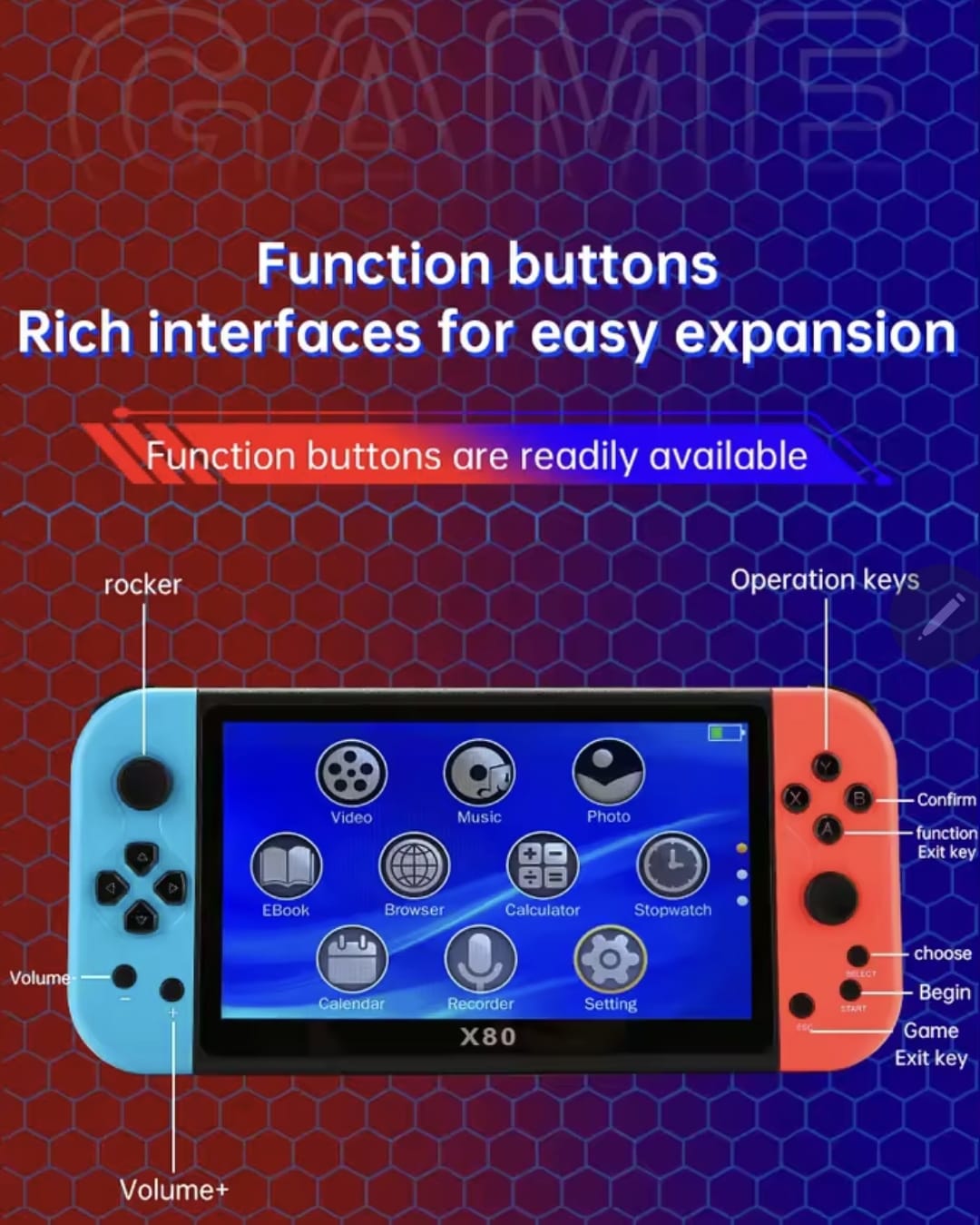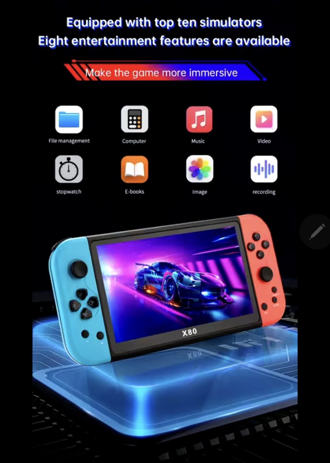 La X80 no es solo una consola de videojuegos... ¡es un dispositivo multifuncional que lo tiene todo! Diseñada para ofrecer una experiencia de entretenimiento completa, combina lo mejor del gaming retro con funciones prácticas que la convierten en un gadget indispensable para todas las edades.